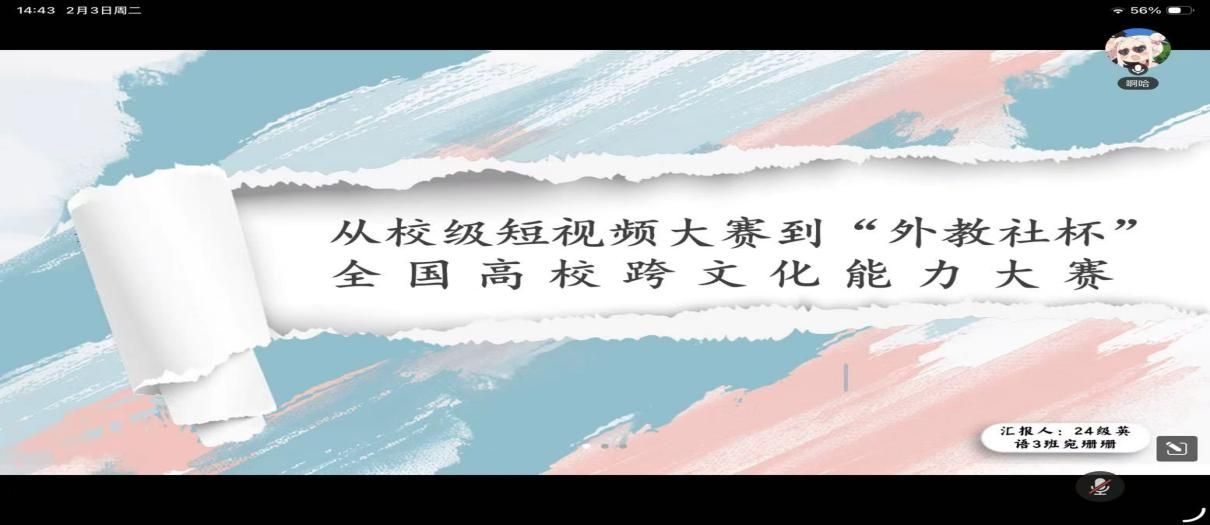 为提升学生新媒体创作能力与跨文化传播素养,助力学子高质量备战省级、国家级大学生短视频竞赛,2026年2月3日下午, 成人有声小说 通过腾讯会议线上举办短视频竞赛备赛经验分享会。会议由向红博士主持,24级英语3班宛姗姗同学担任主讲嘉宾,学院众多意向参赛学子齐聚云端,共学创作技巧、交流备赛心得。