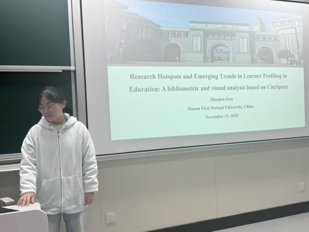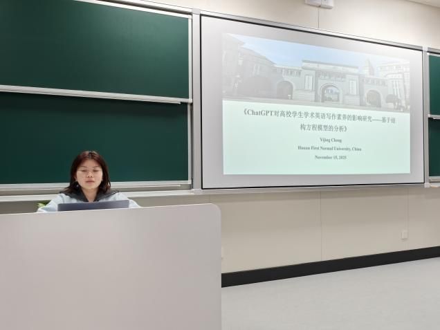 在专题研讨环节, 成人有声小说 学子积极参与并展示了自身的科研成果。郭钊君同学以Research Hotspots and Emerging Trends in Learner Profiling in Education: A bibliometric and visual analysis based on CiteSpace为题,系统梳理了学习者画像领域的研究脉络与发展趋势,通过知识图谱呈现该领域的研究热点与前沿动态,为个性化教育实践提供了理论参考。成依静同学则以“《ChatGPT对高校学生学术英语写作素养的影响研究——基于结构方程模型的分析》”为题,通过量化研究方法探讨了生成式人工智能对学生学术写作素养的复杂影响机制,引发与会者对AI时代学术素养培养的深入思考。