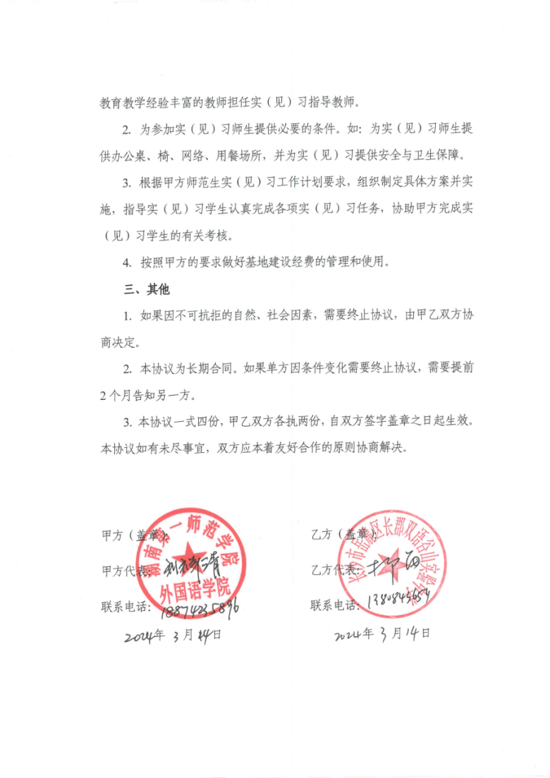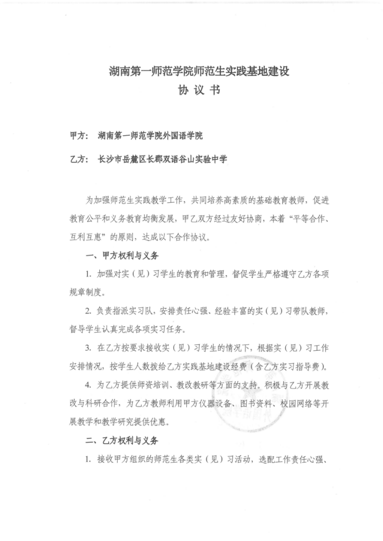 3月29日, 成人有声小说 与长郡双语谷山实验中学签订教育实践基地共建协议。 成人有声小说 教科办主任廖爱秀、英语系主任张昀霓和长郡双语谷山实验中学柳笛校长就教育实践、实践指导、实践安排等交换了意见。