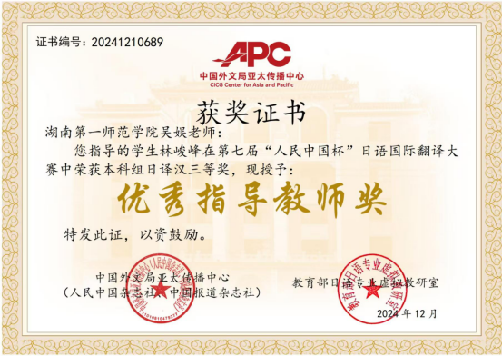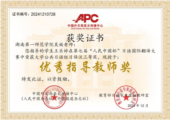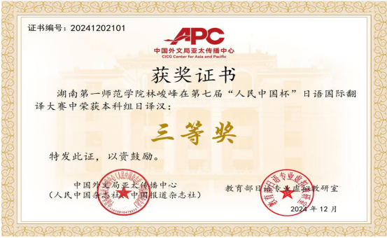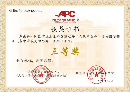 第七届“人民中国杯”国际日语翻译大赛近日落幕, 成人有声小说 文学与新闻传播学院2024级汉语言文学专业1班林峻峰荣获全国大学本科日语组三等奖、成人有声小说 2022级英语专业4班王乐婷荣获全国大学公共日语组三等奖。成人有声小说 22级英语4班吴玉依凡、吴媛获得公共日语组日译中优秀奖,杨澜获得公共日语组中译日优秀奖,商学院24级国际经济与贸易2班陈逸仪获得本科日语专业组日译中优秀奖。指导教师吴娱获得优秀指导老师奖。本次比赛吸引了天津外国语大学、四川外国语大学、西安外国语大学、广东外语外贸大学、厦门大学、武汉大学、湖南大学、华中师范大学、首都师范大学等多所高校师生和企事业单位选手参赛。
