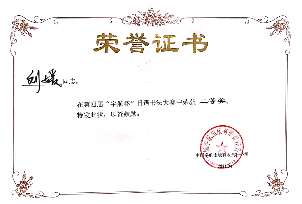 2021年5月,成人有声小说 18英语5班刘媛参加第四届“宇航杯”日语书法比赛获得全国二等奖的好成绩。吴娱老师获得优秀指导老师奖,成人有声小说 获得最佳组织奖。