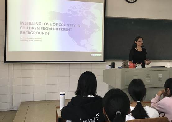 Amy博士的讲座系统梳理了美国历史上的重要事件和文化名人,并向听众展示了美国出版的相关儿童文学作品如何建构这一历史、如何从中培养美国儿童的爱国主义热情。一个半小时的讲座后,现场的学生和老师纷纷向Amy博士提问和请教,大家都表示收获颇丰。