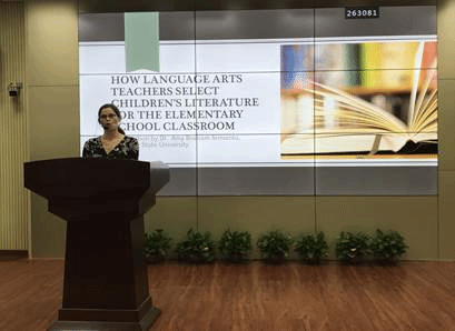10月22日下午,Amy教授在成人有声小说 同声传译室做了题为“How Language Arts Teachers Select Children’s Literature for the Elementary School Classroom”(语言艺术教师如何为小学课堂选择儿童文学)的讲座。副院长康响英教授主持,成人有声小说 一百多名师生参加了讲座。Amy教授介绍了美国小学的教育现状,分析了美国小学生不同阶段的阅读素材。Amy教授重点阐述了小学教师该如何选择合适的儿童文学阅读读物,并在教学中如何进行道德渗透。Amy教授展示了美国最近20年的流行绘本,并以这些儿童文学节选读物为例,指导大家根据作品的内容进行教学,例如教学生做正确的决定、理解家庭的重要性、避免不必要的纷争、明白基督徒的价值观等等。最后Amy教授总结了进行儿童文学教学的意义,即帮助形成正确的价值观、促进儿童的健康成长。