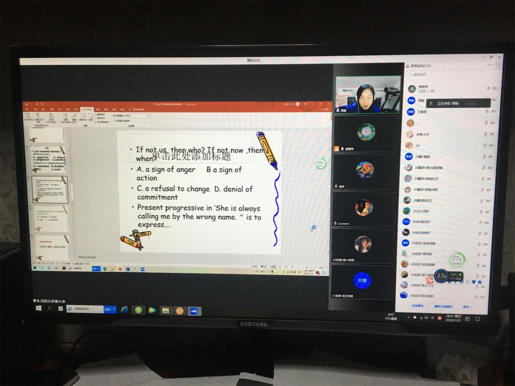 2022年1月23日下午,成人有声小说 举行了英语专业四级考试备考线上动员大会。成人有声小说 刘宇松副院长、系主任张昀霓、教务办廖爱秀老师以及2020级全体学生和21级学委参加了本次动员大会。