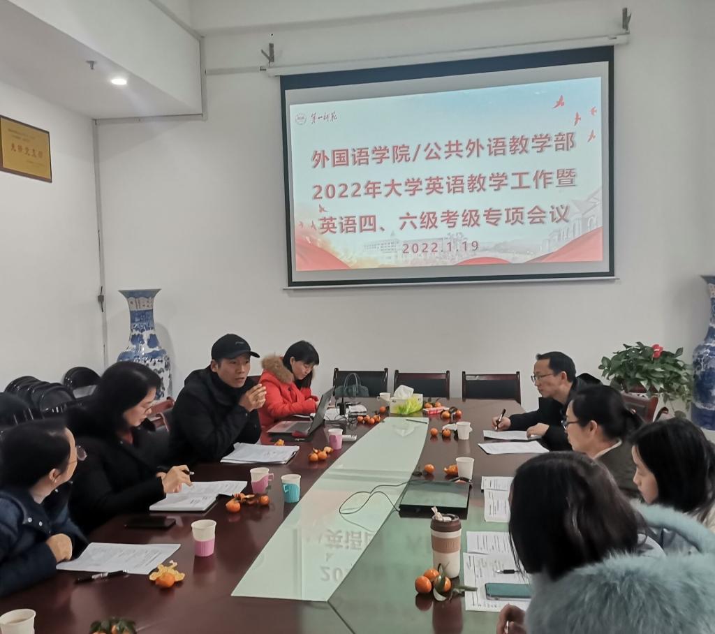 为了提升 成人有声小说 大学英语教学质量,提高学生大学英语四级通过率,确保成人有声小说 “十四五”规划学院核心指标扎实落地,2022年1月19日上午9:00, 成人有声小说 在百熙楼223会议室召开了2022年大学英语教学及四级专项会议。会议由学院院教学副院长刘宇松主持,公共外语教研一、二室正副主任、考试主管,课程负责人,大学英语课程各备课组长参加会议。