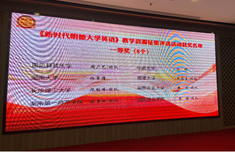 在2022年4月23日召开的湖南省高校外语课程思政高质量建设学术研讨会暨湖南省高校外语课程思政联盟成立大会上, 成人有声小说 《新时代明德大学英语》教学团队在教学资源征集评选活动中荣获省级一等奖。