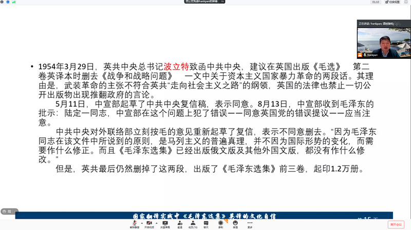 2020年11月24日,上海电力大学成人有声小说 院长、剑桥大学访问学者潘卫民教授应邀为 成人有声小说 省级一流专业(翻译)建设点师生带来了一场题为“国家翻译实践中《毛泽东选集》英译的文化自信”的云端学术讲座。会议由省级一流专业(翻译)建设点专业负责人、湖南省毛泽东诗词外译研究基地首席专家刘明东主持,翻译专业70多名师生参加本次讲座。