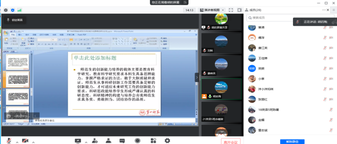 2022年5月5日晚上七点半,成人有声小说 “言语行为科研团队”负责人胡启海教授在腾讯会议线上分享了最新研究成果“基于科研思政的师范生研创能力培养模式研究”。该团队核心骨干成员雷志斌老师、傅萍老师、吴娱老师、唐江英老师也在线分享了自己对所负责部分研究的感悟。康响英副院长,院长助理王佳娣老师、张丽红老师、曾清老师、李满红老师、代正利老师、刘锐老师和学生共30多人参与了这次沙龙活动。