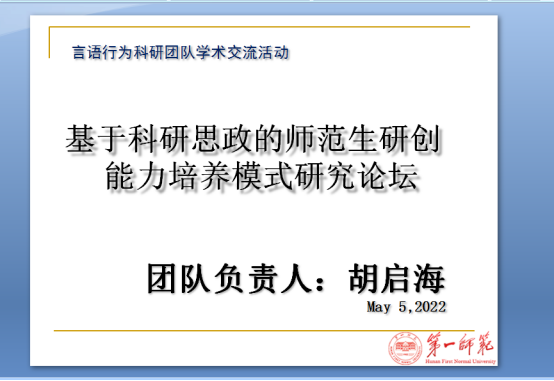 胡启海教授首先阐述了本次学术交流活动的主旨及基于科研思政的师范生研创能力培养模式研究实施的初步方案,并就主题进行了初步求证。研究团队各成员从问题的提出及研究现状分析、师范生科研创新能力的培养目标、师范生科研创新能力模式的构建、培养模式的特色重点举措、推广价值及研究意义六个方面展开了论述。