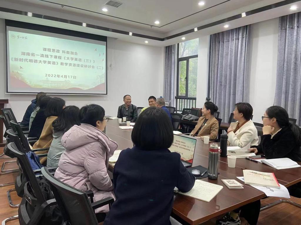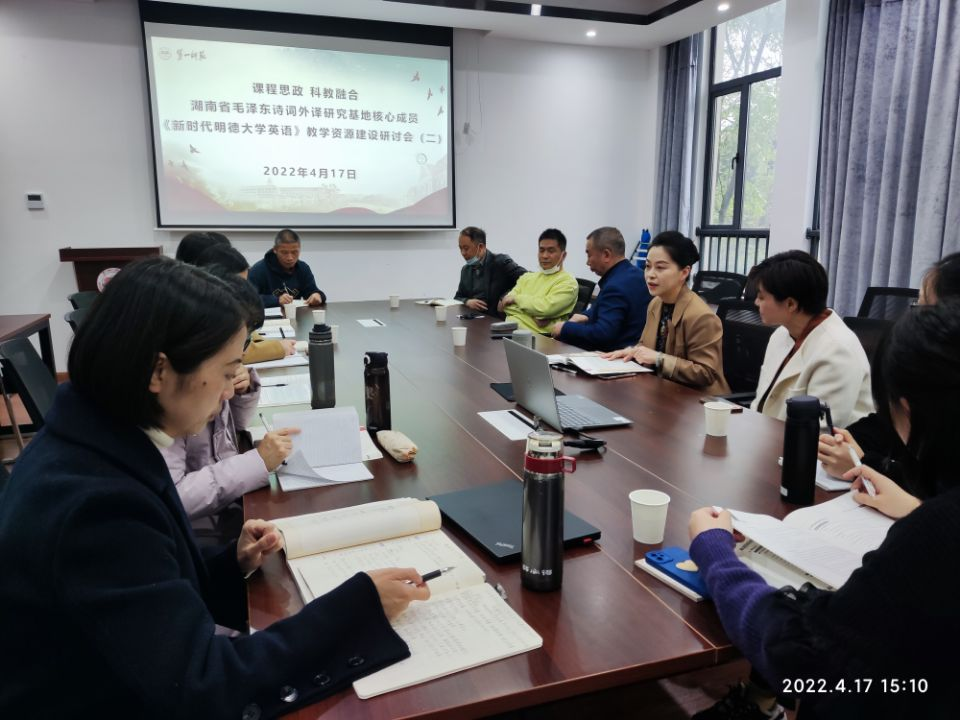为进一步推进《大学英语》课程思政建设,“湖南省毛泽东诗词外译研究基地”核心成员与湖南省一流线下课程《大学英语(三)》课程组成员于2022年4月17日在成人有声小说 会议室再次举行了基于课程思政的《新时代明德大学英语》教学资源建设研讨会。会议特别邀请了《新时代明德大学英语》主编湖南大学成人有声小说 刘正光教授、何岚教授前来指导。整个会议由成人有声小说 陈圣白副院长(主持工作)主持,参加会议的有成人有声小说 刘祥清书记、刘宇松副院长以及陈喜贝、龙君、梁薇、雷琬瑢、唐新萍、谭建慧、陈迎、蒋丽梅等老师,高等教育出版社湖南省教学服务中心李云峰副主任莅临会议。