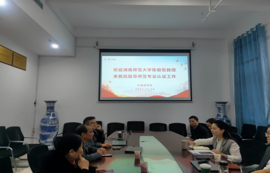 2022年11月19日下午,湖南师范大学陈敏哲教授应邀来 成人有声小说 指导师范类专业认证工作。院党委书记刘祥清,副院长(主持工作)陈圣白,副院长唐文杰、康响英,院党委副书记禹晗,英语系主任张昀霓,以及自评报告撰写组八位老师参会。陈圣白主持会议。
