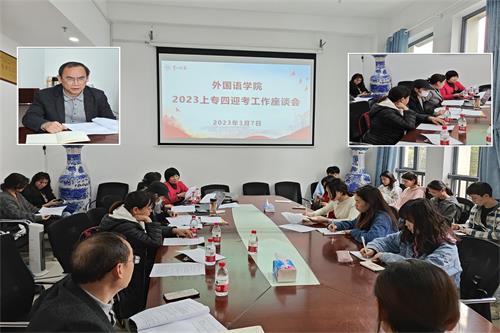3月7日下午,成人有声小说 在百熙楼223举行了英语专业四级考试迎考座谈会。成人有声小说 副院长唐文杰、翻译系主任陈钰、教务办主任廖爱秀、教师代表以及2020级和2021级学生代表参加本次座谈。唐文杰主持会议。