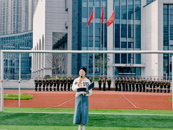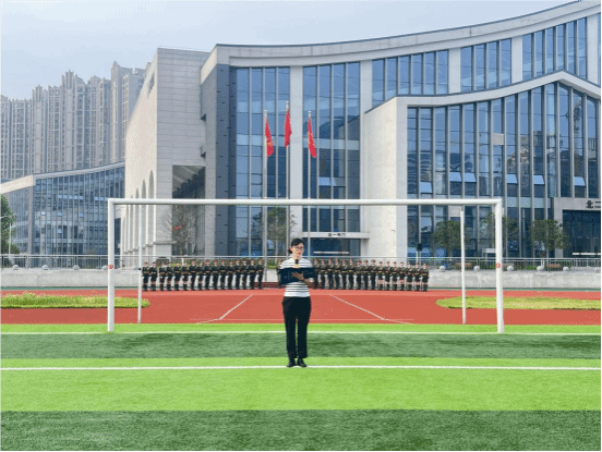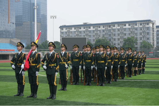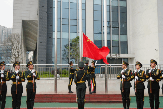 随着激昂的进行曲响起,国旗护卫队昂首挺胸、步伐铿锵地走向升旗台。在庄严的国歌声中,鲜艳的五星红旗冉冉升起,全体师生神情肃穆、整齐肃立,向国旗行注目礼。嘹亮的歌声如浪潮般在田径场上空激荡,饱含着对祖国的无限热爱与赤诚情怀。