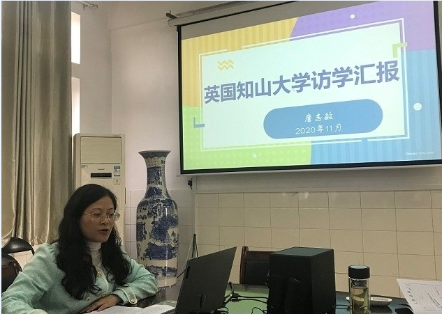 首先,唐志敏老师从生活、学习以及文化交流三个方面介绍了她在英国知山大学访学五个多月的见闻、感受、及收获。她认为,此次访学不仅结识了热心的国际友人,近距离地了解了英国文化,更重要的是在学习的同时很好地进行了中西文化的传播和交流。