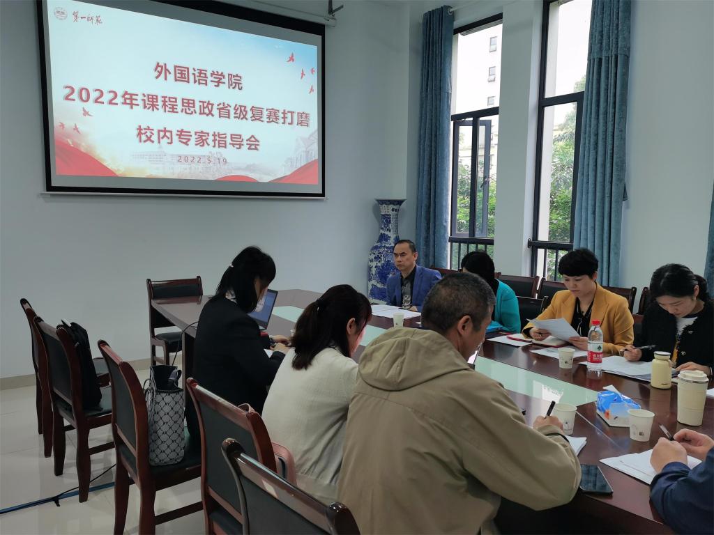 2022年5月19日下午,成人有声小说 省级课程思政复赛校内专家打磨研讨会在百熙楼223会议室举行。会议邀请教务处副处长唐文杰、现代教育发展学院院长曾晓洁、文学与新闻传播学院副院长罗燕、成人有声小说 刘明东教授、2021年国家级课程思政教学设计比赛特等奖获者李双老师5位专家为 成人有声小说 参加省级课程思政复赛的王彩虹、雷琬瑢两位教师进行课程设计打磨和润色。成人有声小说 党委书记刘祥清教授参加。学院副院长刘宇松主持。