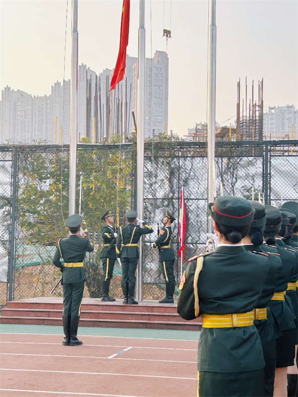 7时整,主持人宣布升旗仪式开始。伴随着铿锵有力的音乐,国旗护卫队迈着整齐划一的步伐,护着鲜红的国旗走到旗杆前。在场的全体成员齐唱国歌,面向国旗行注目礼,五星红旗在朝阳中冉冉升起。