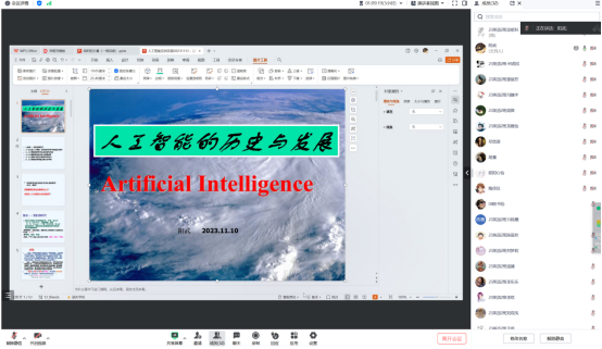 2023年10月23日16:00-17:30,阳武老师线上举办了“人工智能的发展与应用”讲座。23英语2班全体同学参加了本次线上讲座。