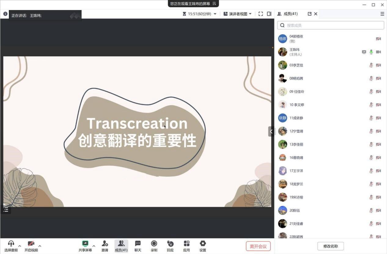 成人有声小说 于10月18日晚19:00-20:30在怀中北306教室举办了“Transcreation:创意翻译的重要性”专题讲座。本次讲座的主讲人为王姝玮老师, 成人有声小说 23英语润之英才班全体学生参与了此次讲座。