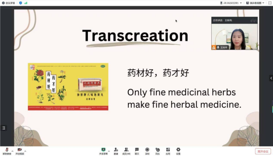 王老师为学生介绍了创意翻译的相关方法和技巧。首先她以饶有趣味的方式向全体与会学生介绍了创意翻译的基本定义(创造一个与目标文化和受众相适应的新内容)及其重要性,并指出:如今世界变得越来越全球化,创造性的翻译已成为必需品,作为新时代英语专业的学生需要克服文化和语言障碍的挑战以构筑跨文化交流的桥梁。之后,王老师以三个例子(如将sense and simplicity翻译为“精于心,简于形”)深入阐释了创意翻译运用的实际语境,进一步深化了学生认知。
