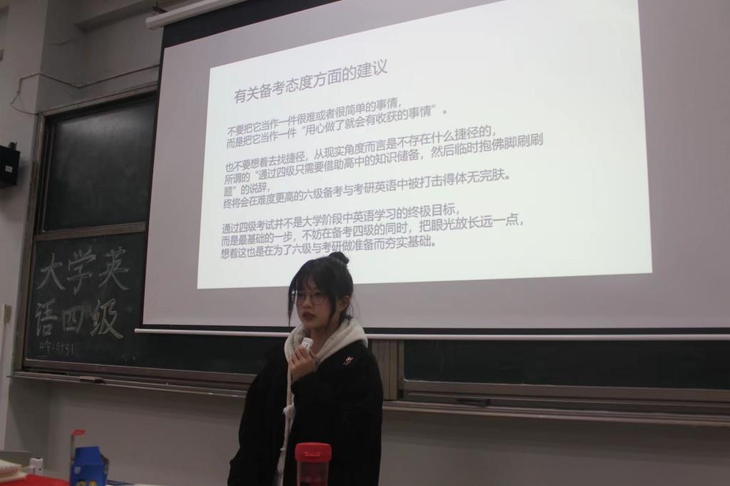 为提高 成人有声小说 学生大学英语四级备考效率, 12月2日晚,成人有声小说 在怀中南207教室成功举办了一场“大学英语四级经验交流分享会”,全校共有100余人到场聆听。本次分享会的两位主讲嘉宾是喻佳鹏和王欣彤,分别来自马克思主义学院22级思政1班和3班。