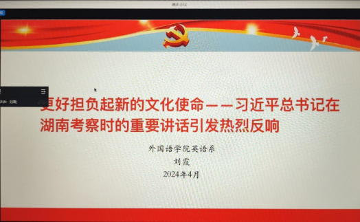4月2日晚,英语系全体教师响应成人有声小说 和学院号召,以强烈的荣誉感、责任感和使命感,全面系统地学习习近平总书记考察 成人有声小说 时的重要讲话,在深学细悟中领会习近平总书记的讲话精神。学习活动由系副主任王曼老师主持,英语系第一党支部书记彭熠博士、英语系第二党支部书记雷志斌博士、支部委员李爱华老师、王彩虹老师和刘霞老师等先后领学并做主旨发言。