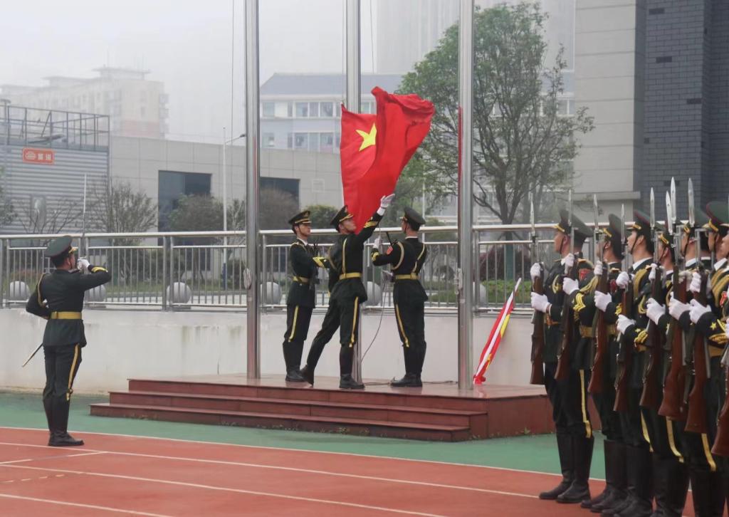英姿飒爽的国旗护卫队队员护送着鲜艳的五星红旗走上升旗台,在全体师生的注目礼下,在庄严的《义勇军进行曲》中,五星红旗冉冉升起。
