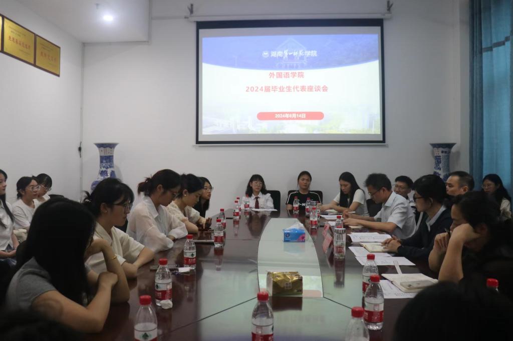 2024年6月14日,学院在百熙楼223会议室召开2024届毕业生代表座谈会。学院党委书记何培森、党委副书记戴建宇、副院长王佳娣、翻译系党支部书记胡启海、英语系副主任王曼、教科办主任廖爱秀、学工办主任刘洁、毕业班辅导员谭梦、陈蓓以及毕业生代表共计40余人参加了此次会议。会议由戴建宇主持。