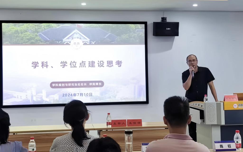 文学与新闻传播学院院长龙永干教授以“新文科背景下学院专业建设”为题,分享了管理经验与专业建设思考,重点讲述了培养方案制定、课程建设、教材建设、课堂教学等方面的重点与难点,并对学院的科研工作从自我发现、科研选题、持之以恒及论文投稿等方面给予了具体的指导。