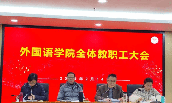 党委书记何培森强调了本学期七项重点任务。首先,必须坚决打赢本科教育教学审核评估的攻坚战,这关系到每位教师,每个人都肩负着责任。其次,要积极推进专业结构的优化与调整,具体而言,英语师范专业需升级,非师范专业应拓展,翻译专业须改造。第三,深化人才培养改革是关键,包括修订人才培养方案,加强招生、就业及研究生考试等工作,特别要重视推进润之英才班的建设工作。第四,要切实加强教学各环节的管理,积极促进教研活动的深入开展,开展“走进访请”活动,推动产教融合和校企合作,同时强化课程建设等。第五,要确保项目平台的申报与建设工作得到妥善执行。第六,要让学生增强专业认同感,扎实推进学风建设。最后,必须持续加强安全教育工作,教师课堂教学意识形态安全管理不容忽视。