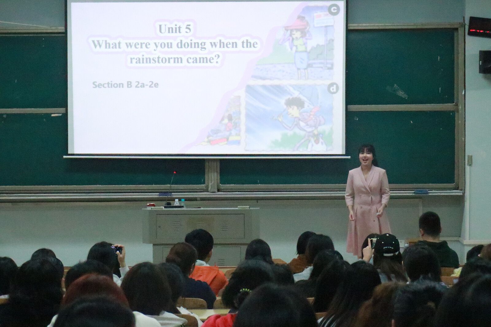 活动伊始,学生代表佘嘉威进行了教学片段展示。她以“暴雨来时你正在做什么”这一生活化问题切入,引导学生分享个人重要事件的经历,随后自然过渡到“我们为何分享重大事件”的课文主题教学中。通过讲解“马丁·路德·金遇刺”与“911恐怖袭击”两个典型案例,逐步引导学生分析人们在特殊时刻的即时反应与情感体验,生动诠释了“重大事件承载难忘记忆”这一核心内涵。