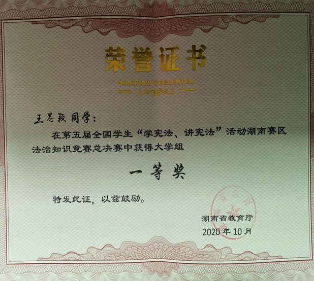 此次“学宪法讲宪法”活动比赛共有初赛和决赛两个环节。 成人有声小说 王思颖同学在马克思主义学院肖霄老师的指导下认真学习宪法知识,完成好每一道学习题库中的题目,经过半个月的反复练习和老师的要点指导,王思颖同学最终获得第五届全国学生“学宪法讲宪法”活动湖南赛区法制知识竞赛总决赛大学组一等奖的好成绩。