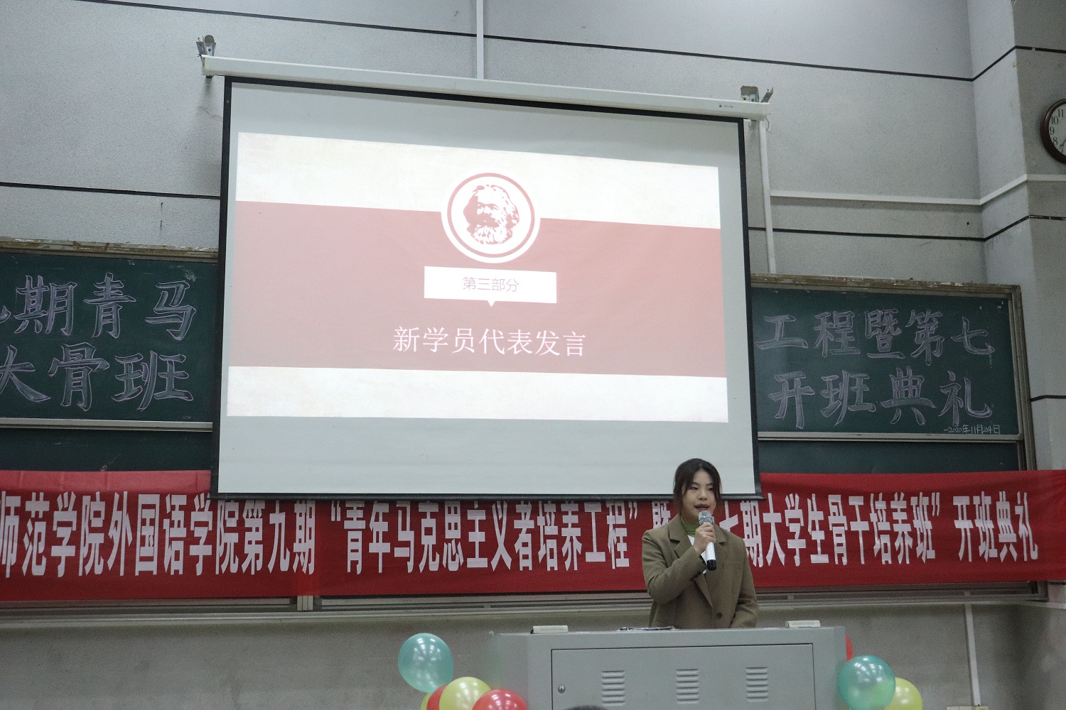 典礼在全体成员共同奏唱的《共青团团歌》中拉开帷幕。在开班典礼上,新学员代表谭明慧首先发言,她表示通过学生骨干培养班的学习,将更加明白自己前进的方向;接着,由团总支办公室副主任刘帅兰宣读了青马工程学员守则,明确了本期培训班的学习目标与学习纪律。