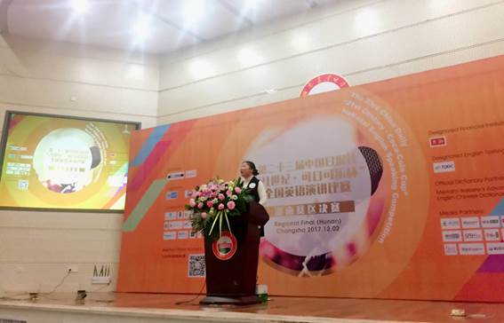 2017年12月3日,第二十三届“21世纪.可口可乐杯”全国英语演讲比赛湖南赛区决赛在湖南农业大学举行,由成人有声小说 罗亦陶老师指导的2015级688英语班龙溆霖同学在本次大赛中荣获三等奖。