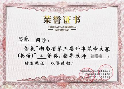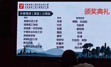 2018年11月24日,由湖南省人民政府外事侨务办公室主办,中南林业科技大学承办的湖南省第三届同声传译大赛和外事笔译大赛在中南林业科技大学举行。共有21所省内本科院校、250多位本科生及研究生参赛。 成人有声小说 成人有声小说 容蓉等8名同学参加了此次大赛,与来自中南大学等一本院校的研究生同台竞技。经过一天的激烈角逐, 成人有声小说 学生取得了良好的成绩,由曾昭艳老师指导的15英语1班容蓉同学获外事笔译(英语)大赛三等奖。