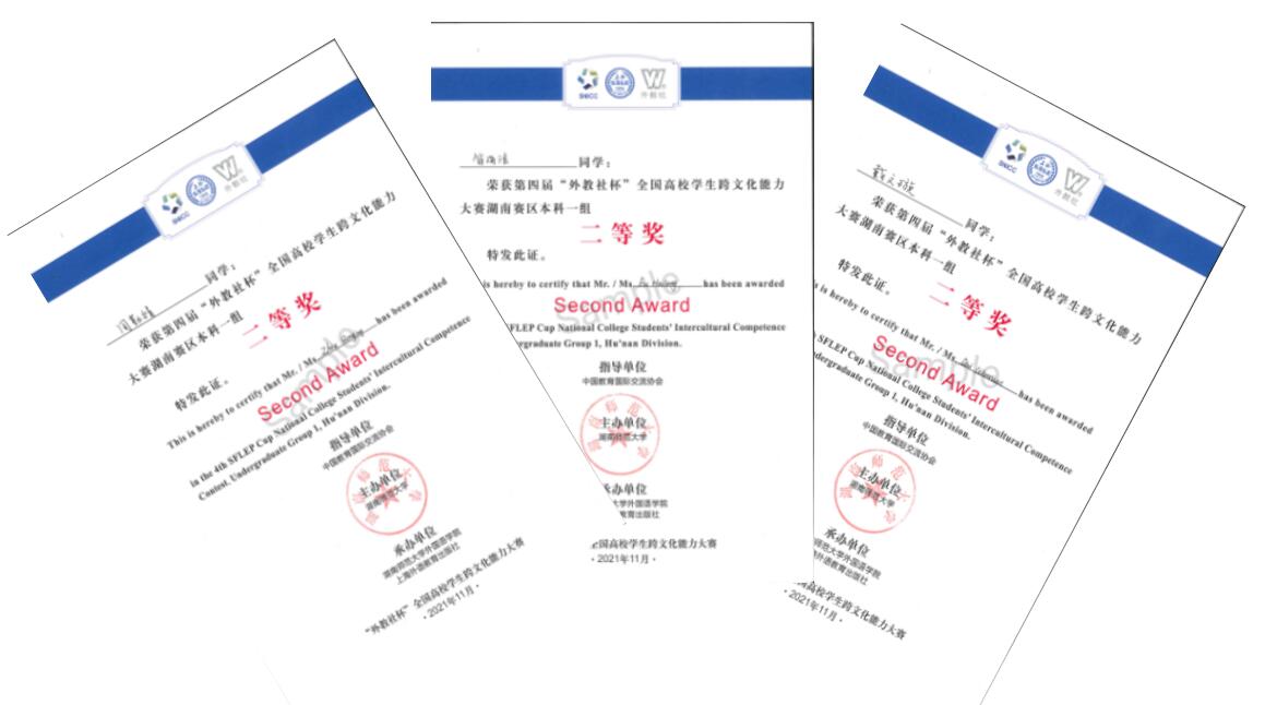 2021年11月26日至27日,第四届“外教社杯”全国高校学生跨文化能力大赛颁奖典礼在湖南师范大学成功举办, 成人有声小说 由戴文璇、周勤婧和符海浪组成的代表队,在成人有声小说 康响英教授、陈钰副教授和代正利老师的悉心指导下,荣获湖南赛区二等奖,充分展示了 成人有声小说 学子的跨文化综合能力。