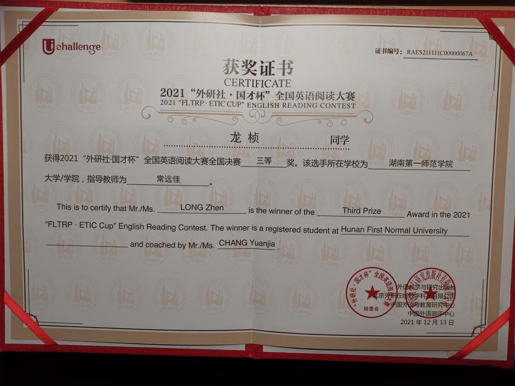 2021年11月27到28日,“外研社·国才杯”全国英语阅读大赛湖南赛区复赛在湖南工业大学举行, 成人有声小说 学子龙桢在成人有声小说 常远佳博士指导下,以湖南省第二名的优异成绩进入了全国决赛,并在决赛中取得了三等奖的好成绩,充分展示了 成人有声小说 学子的英语水平。