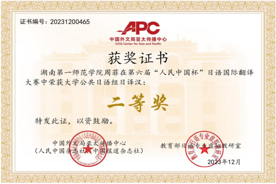 “人民中国杯”国际日语翻译大赛是是国内最具专业性、权威性的日语翻译赛事。大赛在中国外文局翻译院和中国外文局CATTI项目管理中心联合发布的《2022国内翻译赛事发展评估报告》中被评为2022年主流翻译赛事。本次大赛历时8个月,共有来自中国和日本700多所高校和企事业单位的近万名选手参赛。成人有声小说 学子2022、2023连续两年在CATTI杯全国翻译比赛中获得二、三等奖。翻译比赛获奖彰显了 成人有声小说 学子的多语种能力和翻译专业师资队伍对多语能力培养的注重。