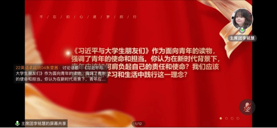 为深入学习贯彻党的二十大精神,推动习近平新时代中国特色社会主义思想的青年化阐释与传播,引导广大青年树立正确的世界观、人生观、价值观, 成人有声小说 于2024年7月28日举行“青春共读•领袖心语——《习近平与大学生朋友们》第二卷专题读书会”活动。本次活动采取线上形式开展,2022、2023级班干部参加,学生会主席团成员李铭慧主持。