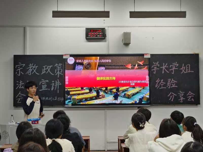 本次活动由21级英语5班的佘奕涓同学、22级英语润之英才班的朱雯茜、成铎文同学以及23级英语5班的樊荣同学担任主讲。他们分别介绍了“学科教学(英语)、外国语言学及应用语言学、英美文学与比较文学、翻译实践(口译)”四大专业方向的基本情况与个人学习经验。