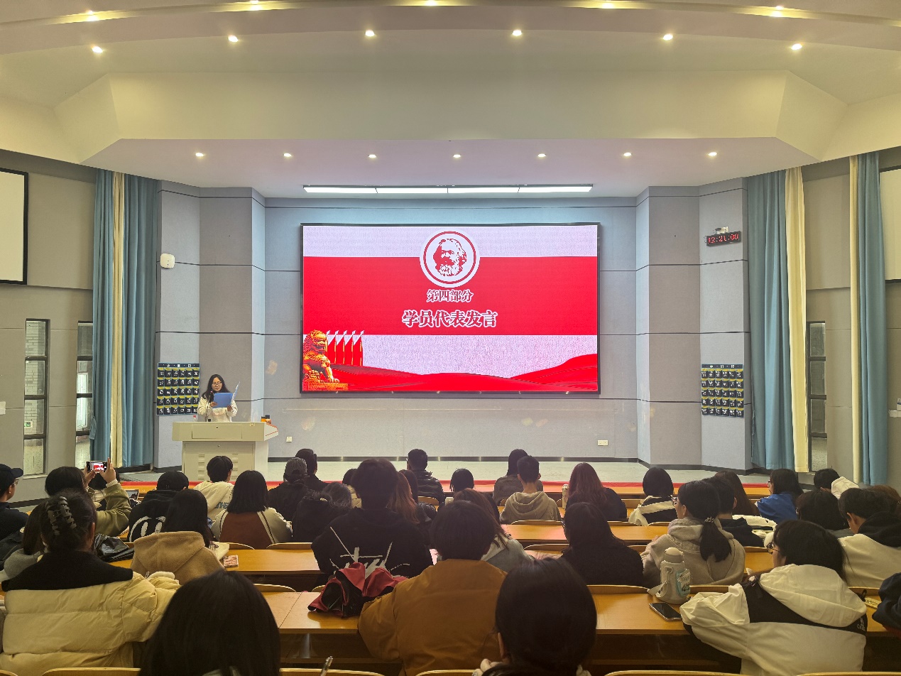 随后是来自23级英语3班的申励岚同学作为新学员代表诚挚发言。“作为新时代的大学生干部,我们深知这次学习机会的重要性。它不仅仅是一次提升自我、充实自我的机会,更是一次实现自我价值、为社会贡献力量的起点。”活动现场,申励岚同学的慷慨陈词鼓舞和激扬着在场的老师和学员们,有力号召着新学员们抓住本次培训的机会,做新时代坚定的马克思主义者,提高作为青年群体的思想政治素质、政策理论水平、创新能力以及实践和组织协调能力。在重重考验中坚定理想信念,逐步成长为新时代中国特色社会主义事业的合格建设者和可靠接班人。