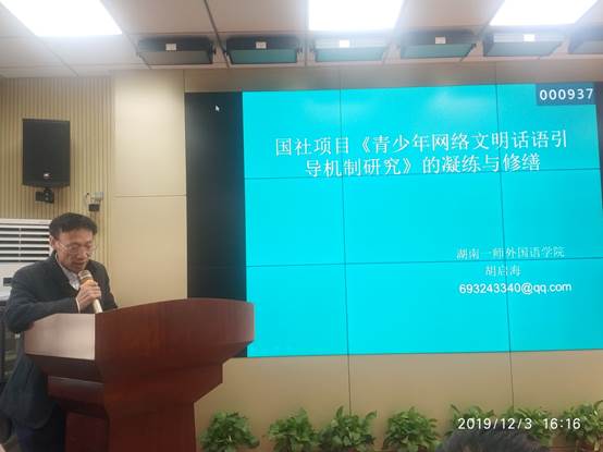 2019年12月3日下午,成人有声小说 举行“乐之论坛”活动,胡启海教授在怀中北605教室为全院师生做了一场题为“国社项目《青少年网络文明话语引导机制研究》的凝练与修缮”讲座。参加人员为成人有声小说 院领导、部分教师和学生代表。