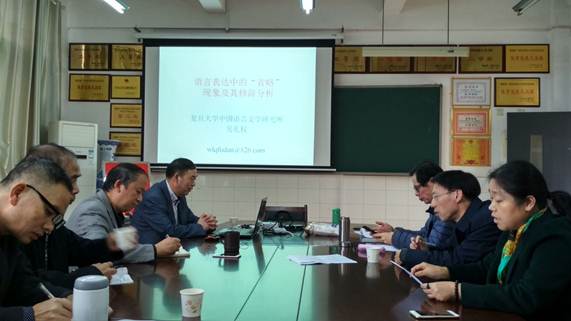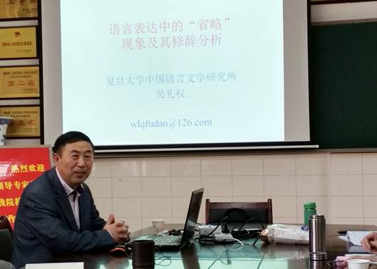 10月23日下午,应成人有声小说 “乐之论坛”邀请,复旦大学吴礼权教授来 成人有声小说 讲学。讲座题目为:语言表达中的“省略”现象及其修辞分析。讲座由成人有声小说 副院长康响英教授主持。成人有声小说 的老师和部分学生聆听了本次讲座。