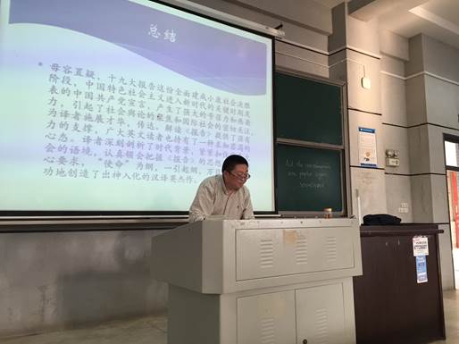 讲座中,耿教授先介绍了政论文的主要特点和政论文翻译应该注意的语言意识、政治意识和读者意识。然后从“凸显主题”、“相机重复”和“贯穿全篇”三个方面,结合十六大、十七大、十八大报告英译实践,对十九大报告英译本的措词、韵律、标点、语气、精气神等进行了仔细对比和研读,对十九大报告英译本中体现出来的弘扬中华优秀传统文化、谋求中华民族伟大复兴、实现伟大中国梦进行了分析。耿教授的报告从文本阅读小处着眼,突出译例分析,从国家文化战略高度立意,教育意义彰显。报告结束时,耿教授告诫学生们,努力学习,加强课外经典阅读,学习和研究中“留心就是学问”(Attention is learning.)。讲座后,耿教授还和同学们进行了交流。