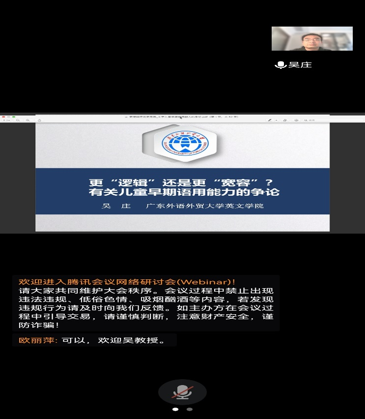 2022年4月19日(星期二)下午,广东外语外贸大学吴庄教授应“乐之论坛”邀请,为 成人有声小说 师生做了一场题为“更‘逻辑’还是更‘宽容’?有关儿童早期语用能力的争论”的线上学术讲座。讲座由康响英副院长主持,全院100多名师生聆听了此次讲座。