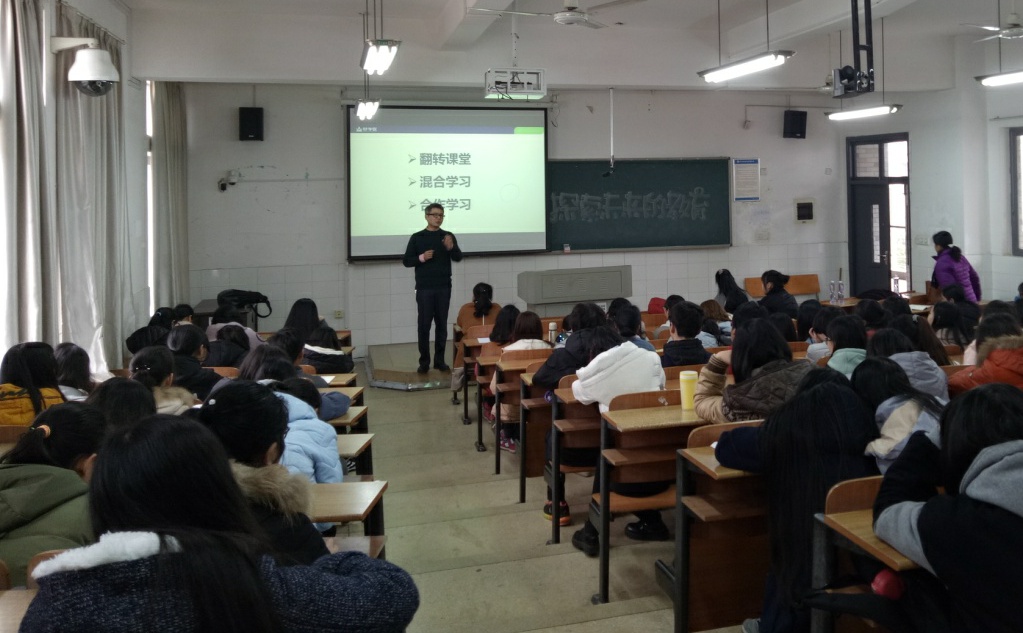 讲座开始,秦先生首先通过一段视频向师生们简单介绍了未来教育的发展趋势。紧接着,他深入浅出地分析了未来教育的三大趋势:一、翻转课堂:利用现代信息技术让课堂知识传授高效化;二、混合学习:根据多样化原则激发学生的学习潜力;三、合作学习:利用“学习金字塔”规律营造主动学习的新环境。秦先生说道:“我们的教育要紧跟未来社会的发展趋势,我们的学生要变被动接受为主动学习;教师要从知识的传授者转变为学习的组织者;课堂的重点也要从知识灌输转移到能力培养上来。”讲座末尾,秦先生呼吁在座的各位师生:纷繁的信息化社会需要提高独立思辨的能力,未来教育更需要我们的共同参与。讲座中,秦先生诙谐幽默而又充满智慧的语言赢得了全场的热烈掌声。