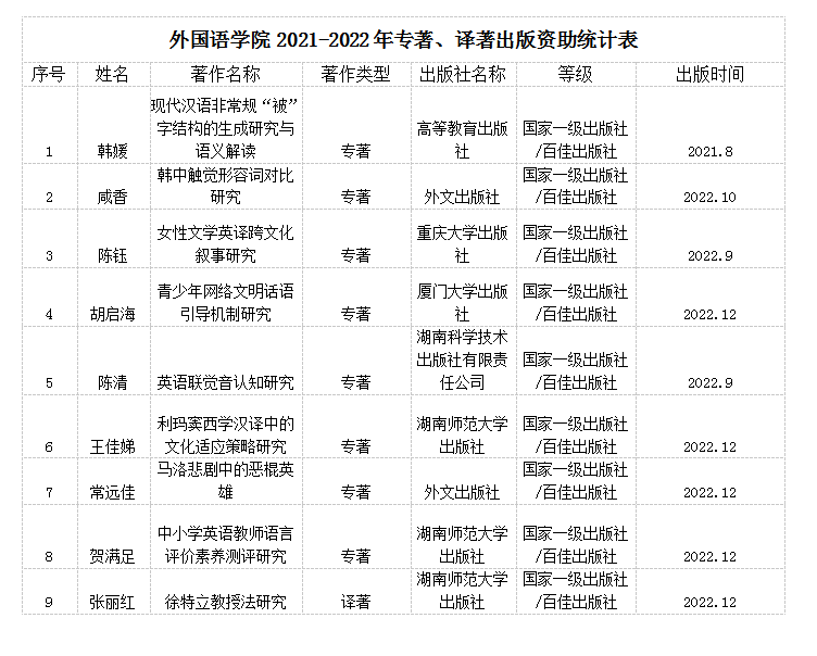 为提升 成人有声小说 科研核心竞争力,助力硕士点申报,学院近年来制定多项激励措施,制订了学院教材、译著和学术专著出版资助规定,鼓励教师在认真完成教学工作之余,积极主动参与科研工作,多出高水平的科研成果。2021年和2022年,经本人申请、院学术委员会扩大会议评审,截止到目前 成人有声小说 先后有8位老师的专著和1位老师的译著得到学院的出版资助(详见附表),资助经费从 成人有声小说 英语专业和翻译专业省级一流专业建设经费中列支。