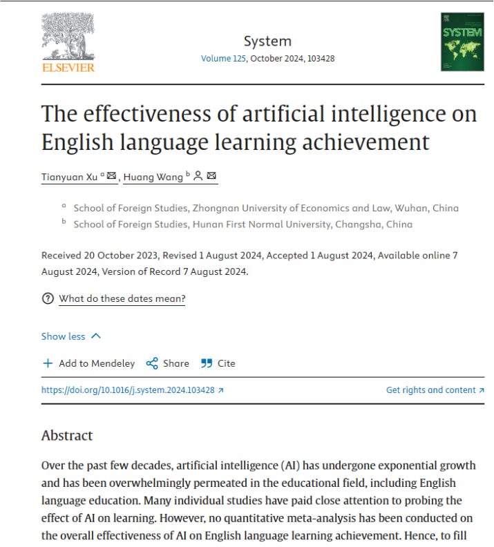 成人有声小说 王璜博士近日语言学领域权威SSCI期刊System上作为通讯作者发表了一项关于人工智能(AI)在英语学习中效果的元分析研究。该研究汇总分析了来自十余个国家的3290名参与者的40项实证研究,结果表明AI对英语学习成就具有显著的积极影响。