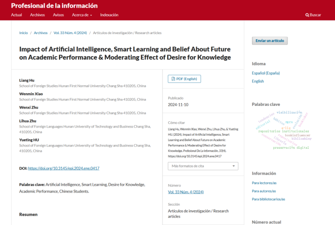 近日, 成人有声小说 胡靓博士带领22级英语润之班肖文敏和朱雯茜两位学生,在国际学术刊物Profesional de la información(SSCI, Q1;IF,=2.6)上发表了题为“Impact of Artificial Intelligence, Smart Learning and Belief About Future on Academic Performance & Moderating Effect of Desire for Knowledge”的学术论文。此论文为 成人有声小说 润之班学生在学业导师的指导下,首次正式发表并被收录的英文论文。该成果的取得,不仅实现了 成人有声小说 师生在学术研究方面的重大突破,也进一步提升了学院的学术影响力。