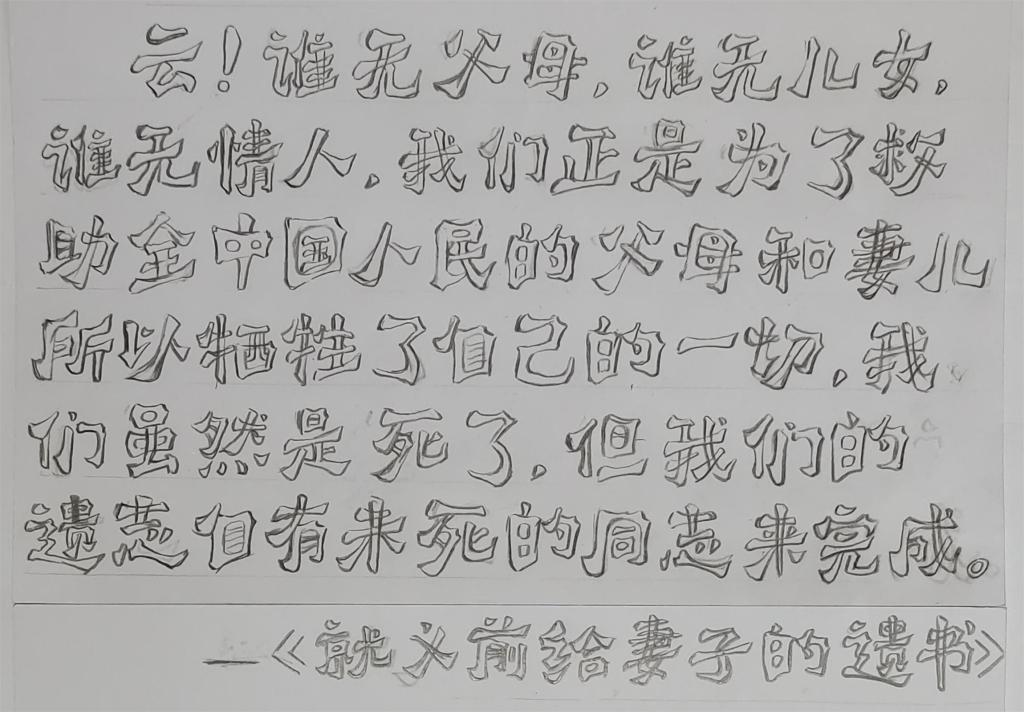 活动中,学生以誊写、朗读烈士家书的形式感悟革命英烈的热血与深情,用烈士家书的情怀谱写新时代中国特色社会主义新篇章。该院学生左乐平朗读的是一封湘籍革命烈士陈觉写给妻子的遗书。“谁无父母,谁无儿女,谁无情人,我们正是为了救助全中国人民的父母和妻儿,所以牺牲了自己的一切……”全文无华丽辞藻,却洋溢着浓浓亲情;无豪言壮语,却充斥着凌然浩气。