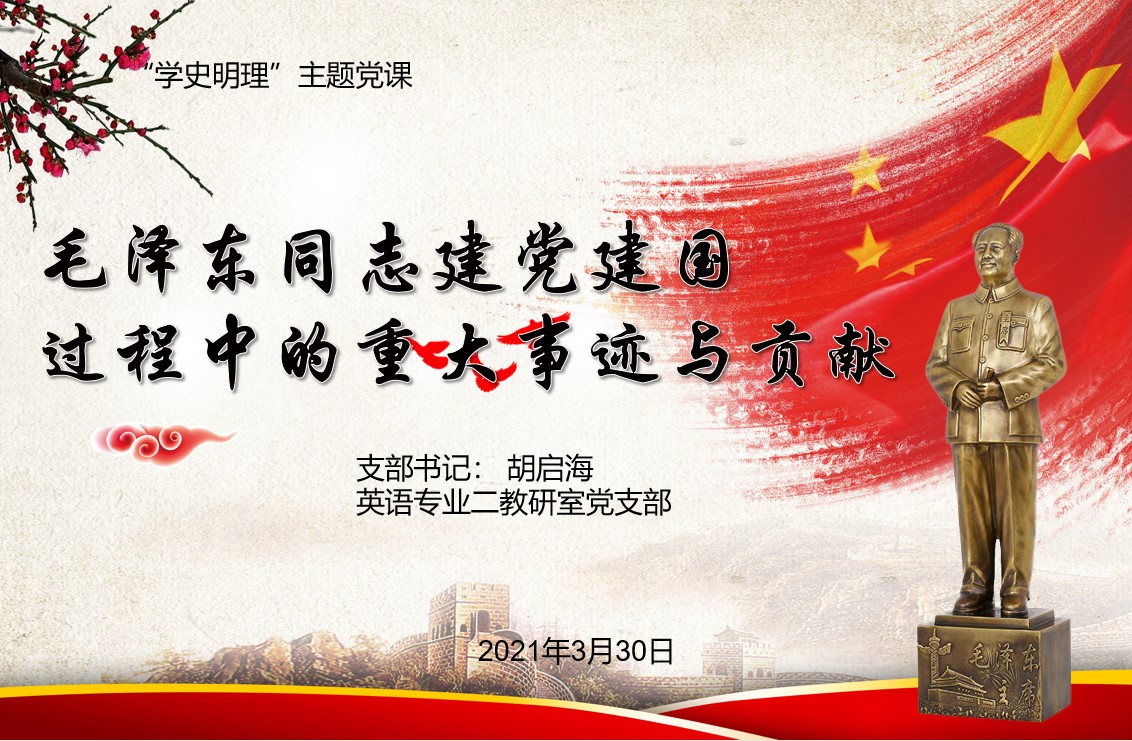 3月30日下午,党支部书记胡启海教授讲党课。党课主题是:毛泽东同志建党建国过程中的重大事迹与贡献。党课主要讲述了毛泽东同志创办《湘江评论》、出席中共一大、创立中共第一个省支部、建立井冈山革命根据地、二万五千里长征、领导抗日救国运动、指挥三大战役直至宣告中华人民共和国成立等重大历史事件,内容丰富,有理论有实例,叙事明理,很有启示和教育意。